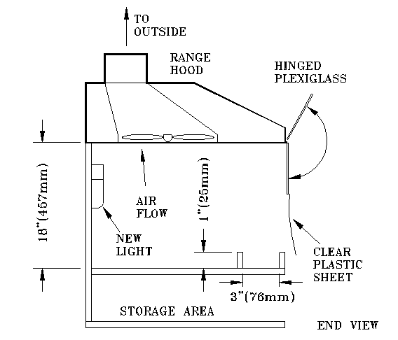 The light in most range hoods are fine for cooking but we need more for painting. There are some people who are worried that any light source not sealed may explode when exposed to the paint fumes. I use fluorescent fixtures and to be safe I tape up any openings that fumes may get into. Another method is to use the clamping lights and have them outside the booth pointing in. If using this method at least two lamps are needed for each side. In figure 2 I have shown the added light at the back. In figure 3 there are two lights clipped onto the front