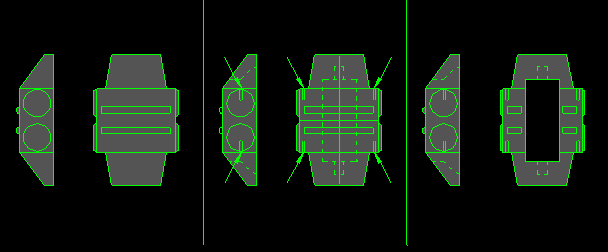 Above is one sample of a brake caliper. There can be slight variations from car to car. In the left diagram is the kit part with a side view and an end view. In the middle diagram the dotted area is the area that is removed so the disc can fit in. the arrows point to common locations that will have to be drilled for various fitting and hoses. The diagram to the right is the finished drilled item. Again check references for exact location of hoses and fittings etc.