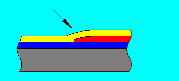 Here is an exaggerated cross section of a model finish with the bottom layer being the plastic. The middle layer is the primer while the red is the paint job. What you are going to try and do is to sand away the hills until the paint is completely flat.