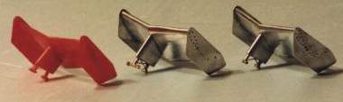 Here is the finished product with kit part on the left and two new wings in the middle and right. On the wing I did, the mounting post is aerofoil shaped. There is aluminum tubing from a hobby store that is similarly shaped. I matched up the kit part to a tubing with a similar shape that was modified. Brass pins were glued into this tubing and holes drilled into the wing to mount it. The brass structure for mounting the wing to the car was soldered together and glued into the aluminum mount. As an added bonus the mounting point to the car is made of tubing. I can use 00-90 nuts and bolts to mount and take off the wing from my model.