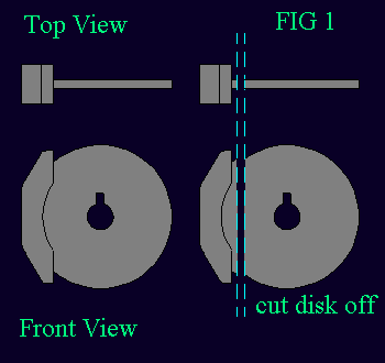 Most kits have lousy calipers and they are molded with the disk. There are some aftermarket calipers in resin and white metal. Detail varies on these objects, they aren't easy to find and they can be pricey. The best (cheapest) solution would be to use the one from the kit or steal one from another kit. The disk will have to be cut off (see Fig 1) and an area has to be gouged out of the caliper to allow clearance for the disk.(see Fig 2.) This is probably the hardest part of the assembly since it is awkward and takes a bit of time to look nice. I usually start off with a cut off wheel in a dremel tool. Clean up with needle files is slow and tedious. Once done you will have to either glue this onto the disk or make a mounting bracket to the wheel hub. I suggest mounting it to the disk.