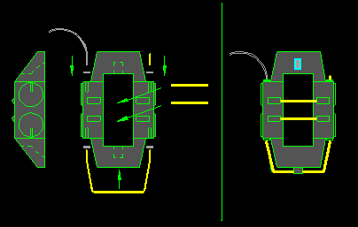 Above is one sample of a brake caliper. There can be slight variations from car to car. In the left diagram is the kit part with a side view and an end view. In the middle diagram the dotted area is the area that is removed so the disc can fit in. the arrows point to common locations that will have to be drilled for various fitting and hoses. The diagram to the right is the finished drilled item. Again check references for exact location of hoses and fittings etc.