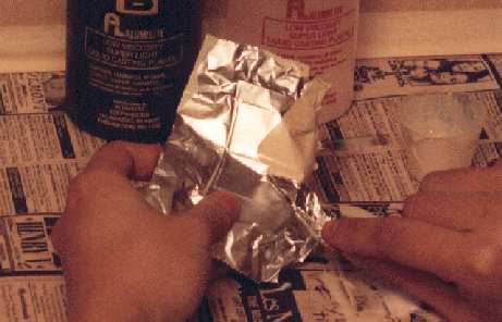 Once the resin is cured (alumilite 5 minutes) you can peel the foil off the resin. If it is hard to take off a knife can help
