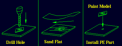 This method can be used every so often. After following the first two steps you thread a wire through the hole. Add a touch of glue to the tip then put the PE part on this. Pull the wire down through the model and the PE part and glue will be left on the model. This method is mainly used for CA glues. The tape method has problems with the glue getting all over the tape then onto the model