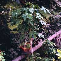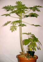 Catalog # 6 - Easily grown indoors, this fast growing succulent has been known to grow to over 7 feet indoors in Canada. (see picture) The unusual leaves are 7-lobed, and it produces its ambrosial peach tasting fruit at an early age. An engaging conversation piece, as papaya is quite known to all, yet few have seen one growing - especially indoors. |