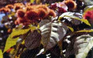Catalog # 56 - An attractive tree with large jade green leaves and heart shaped fruit. Dazzling round fuzzy flowers hang in neat clusters. The seeds are crimson and are used as a natural coloring agent. The local aboriginal natives of the carribean used the annato dye on their bodies; painting themselves a fiery orange red whenever they went in to battle; Scaring their foes into thinking they were supernatural demons. These days the dye is used in cheese, margarine, candy, chocolate, cloth, lipstick and soap. |