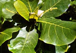 Catalog #140 - An enticing ornamental nut plant with unususal whorls of branches carrying unique, large bright green veined sturdy leaves. The signature blooms are bright shimmering orange. The nutty fruits are large and tasty and much sought after commercially |